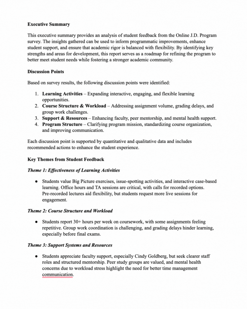 Fradely Delacruz co-conducted a comprehensive analysis of quantitative and qualitative data from the Online J.D. Program Survey to support program improvements, elevate equity, and redesign the student experience for a diverse population of working professionals. Utilizing Google Form survey exports, pivot tables, chi-square testing, and thematic coding, the project surfaced clear recommendations across academic structure, student well-being, and administrative support.